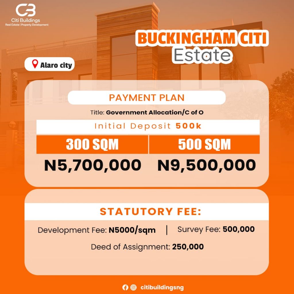 BUCKINGHAM CITY ESTATE is located 10 minutes away from the International Airport and situated at Ilamija, right beside Alaro City , along Lekki-Epe Expressway.